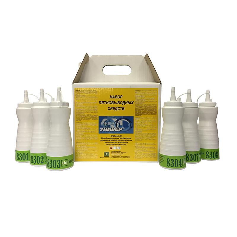 УНИВЕР® 8301 – Пятновыводное средство для предварительной зачистки. Удаляет жировые и масляные пятна, а также пятна косметики, медикаментов, шариковых ручек, травы, пятна продуктов жизнедеятельности человека.